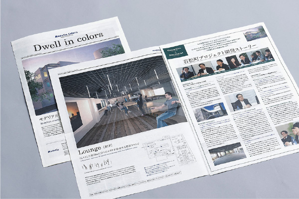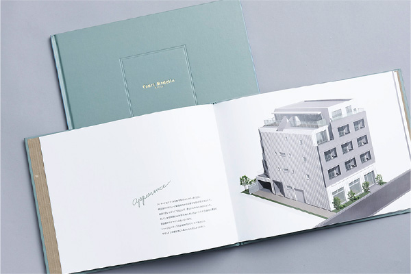 装丁、素材、コンセプトビジュアルなど細部までこだわり抜いたパンフレットを制作。アートブックのような仕上がりは、賃貸マンション情報ツールのイメージを覆す一冊となっています。