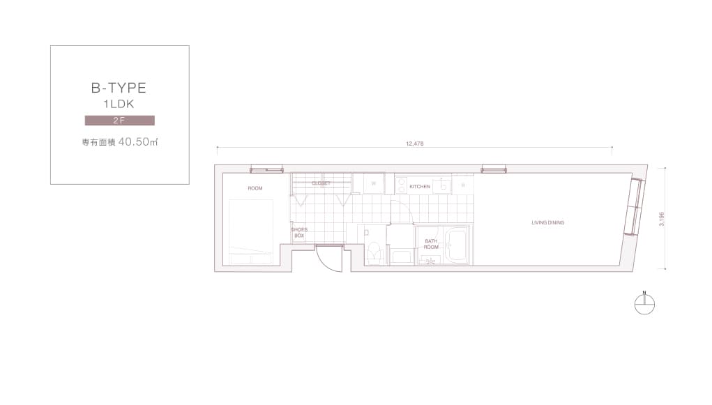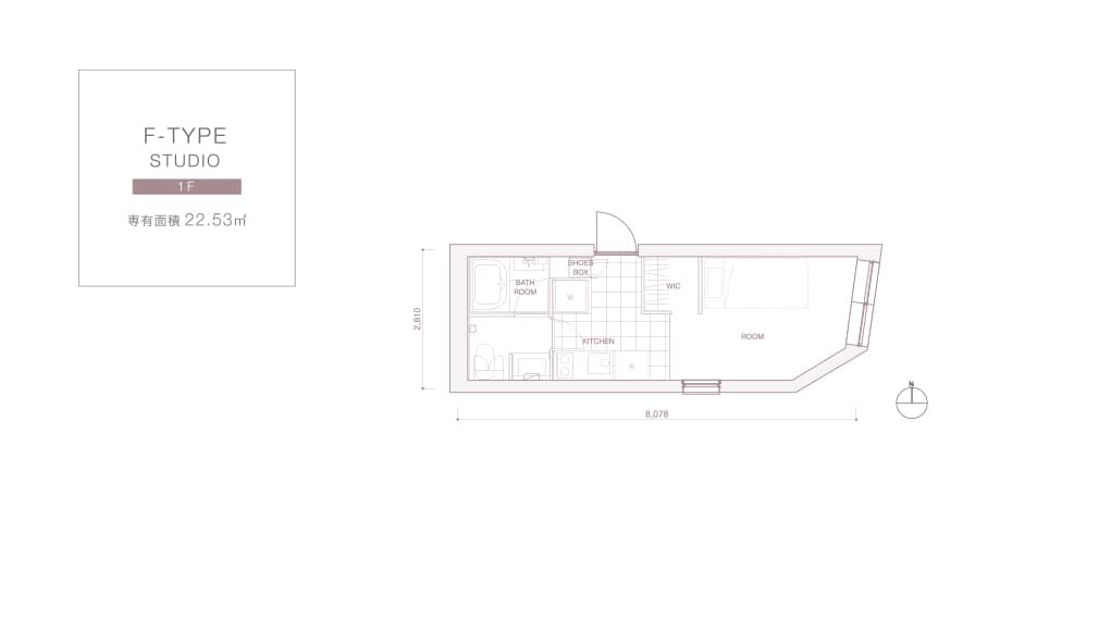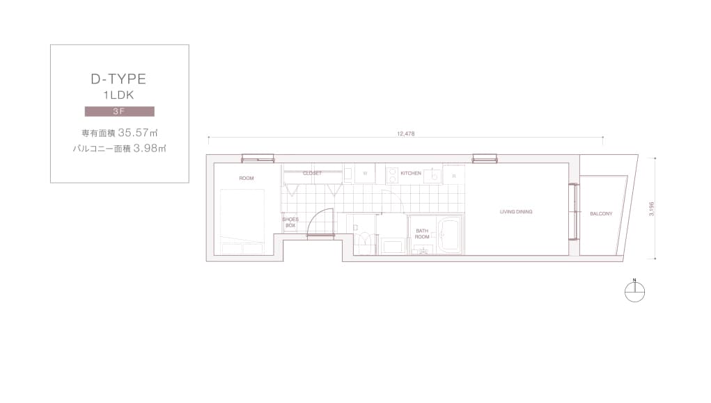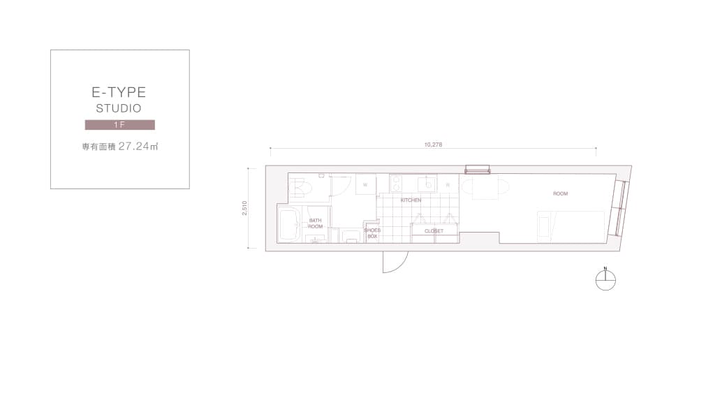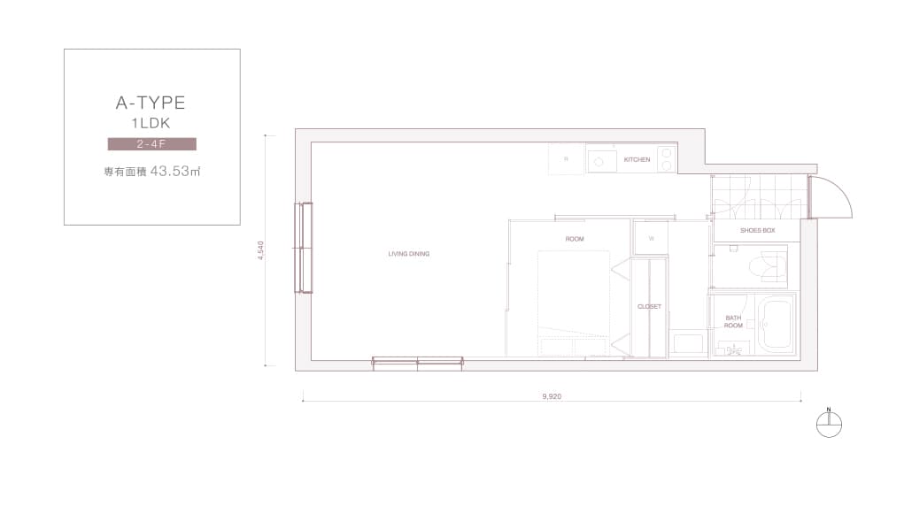 Plan STUDIO / 1LDK ELEVATION DESIGN 東側立面図 北側立面図 ※図面と現況が異なる場合は、現況を優先させていただきます。 PLAN / 1F-4F A-TYPE 1LDK 2-4F 専有面積 43.53 ㎡ B-TYPE 1LDK 2F 専有面積 40.50 ㎡ C-type 1LDK 2-4F 専有面積 31.35 ㎡ D-TYPE 1LDK 3F 専有面積 35.57 ㎡ バルコニー面積 3.98 ㎡ D’-TYPE 1LDK 4F 専有面積 35.57 ㎡ E-TYPE STUDIO 1F 専有面積 27.24 ㎡ F-TYPE STUDIO 1F 専有面積 22.53 ㎡ OFFICE / 1F 専有面積 50.56㎡
