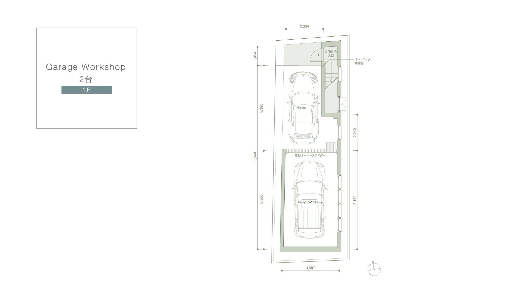 コンクリート打ち放し仕上げの堅牢なイメージのインナーガレージ。杉板型枠コンクリート壁と天然木の軒天井が映えるシャープな中にも温かみを感じる半屋外ガレージ。電動のオーバースライダーを開放して、2つのガレージを一体的に使うこともできます。愛車と共に夢を見てほしいガレージワークショップです。