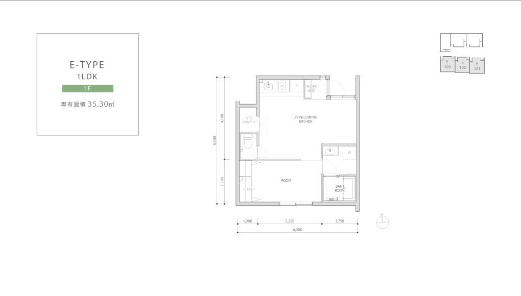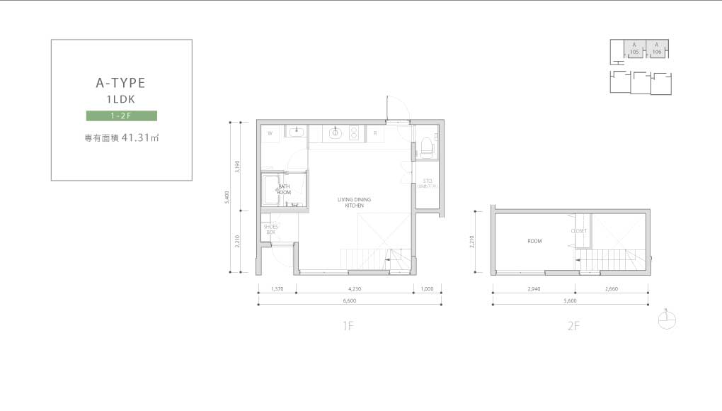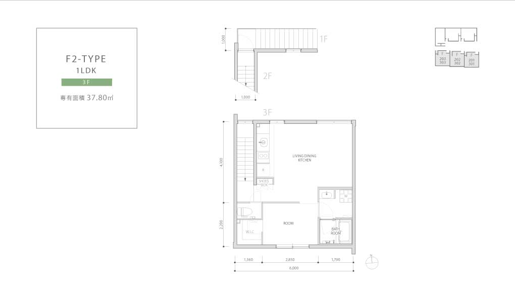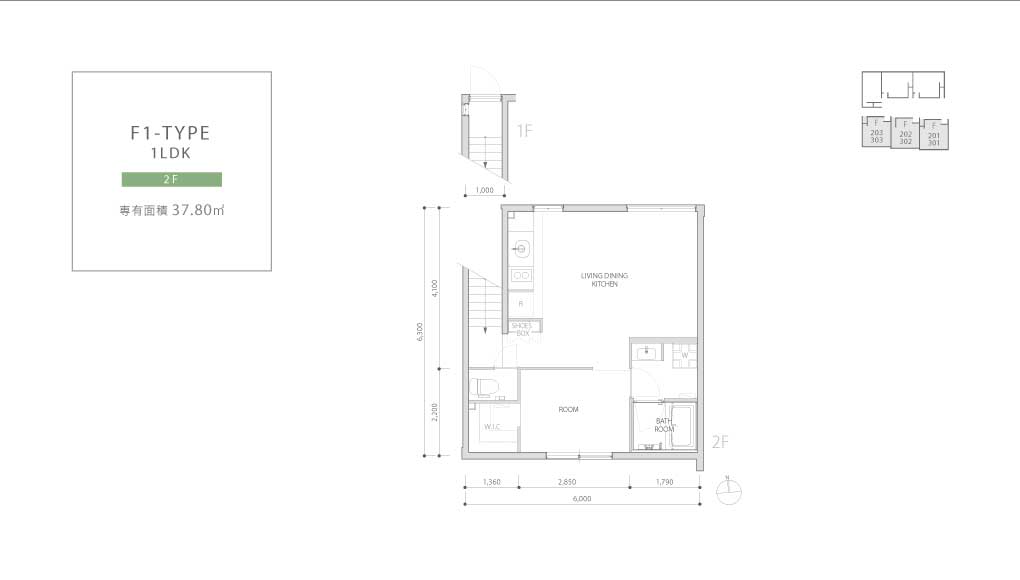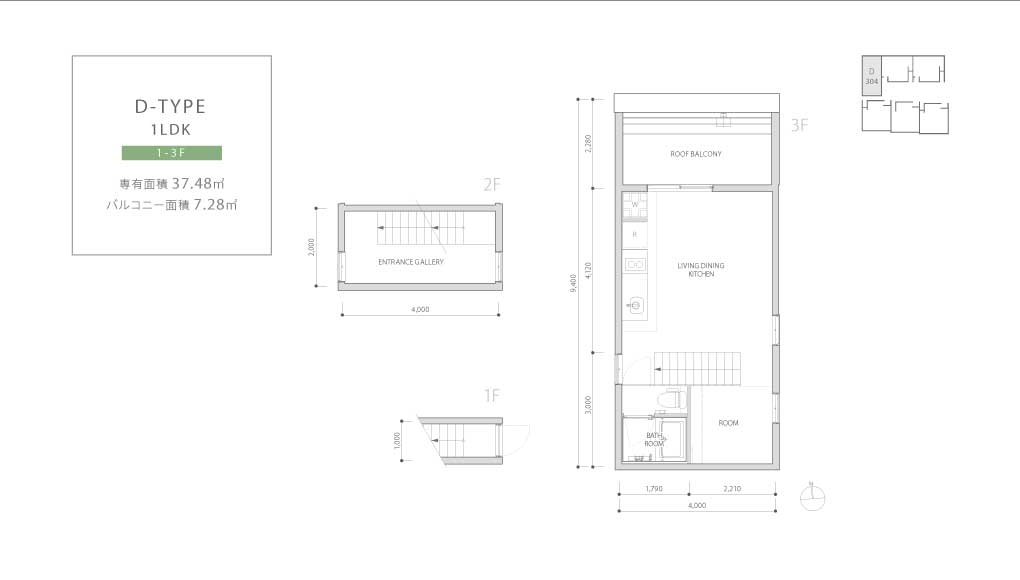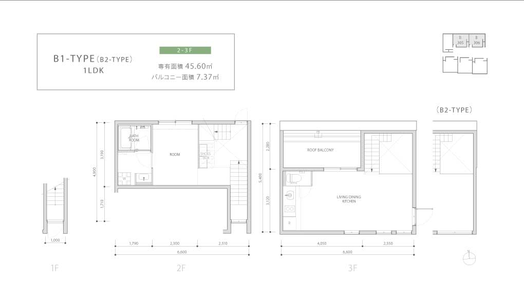 Plan 1LDK ELEVATION DESIGN 中庭側南立面図 中庭側北立面図 東側立面図 西側立面図 南側立面図 北側立面図 ※図面と現況が異なる場合は、現況を優先させていただきます。 PLAN / 1F-3F A-TYPE 1LDK 1-2F 専有面積 41.31 ㎡ B1-TYPE(B2-TYPE) 1LDK 2-3F 専有面積 45.60 ㎡ バルコニー面積 7.37 ㎡ C-TYPE 1LDK 1-2F 専有面積 43.02 ㎡ D-TYPE 1LDK 1-3F 専有面積 37.48 ㎡ バルコニー面積 7.28 ㎡ E-TYPE 1LDK 1F 専有面積 35.30 ㎡ F1-TYPE 1LDK 2F 専有面積 37.80 ㎡ F2-TYPE 1LDK 3F 専有面積 37.80 ㎡