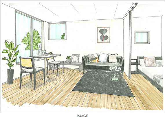 <SINGLE>外資系ITエンジニア30代前半男性の住居をイメージしました。使い勝手の良い1LDKタイプの間取りです。大きな開口からの自然光や心地よい風が生活のリズムを整えます。ダークカラーの家具でまとめたクールなインテリアをベースに、アートやファブリックで遊び心や暖かみを織り交ぜ、居心地のよさを演出。人が自然と集まりたくなるような解放感に溢れるLDK空間は、親しい友人を招き得意料理を振る舞いながらお酒を楽しむのに最適です。ベッドルームや書斎としても利用可能なRoomは引き戸を閉めることで、落ち着いた「ひとり時間」を過ごすこともできます。解放感とプライバシーを両立させ、暮らし良さを追求した住まいのご提案です。
