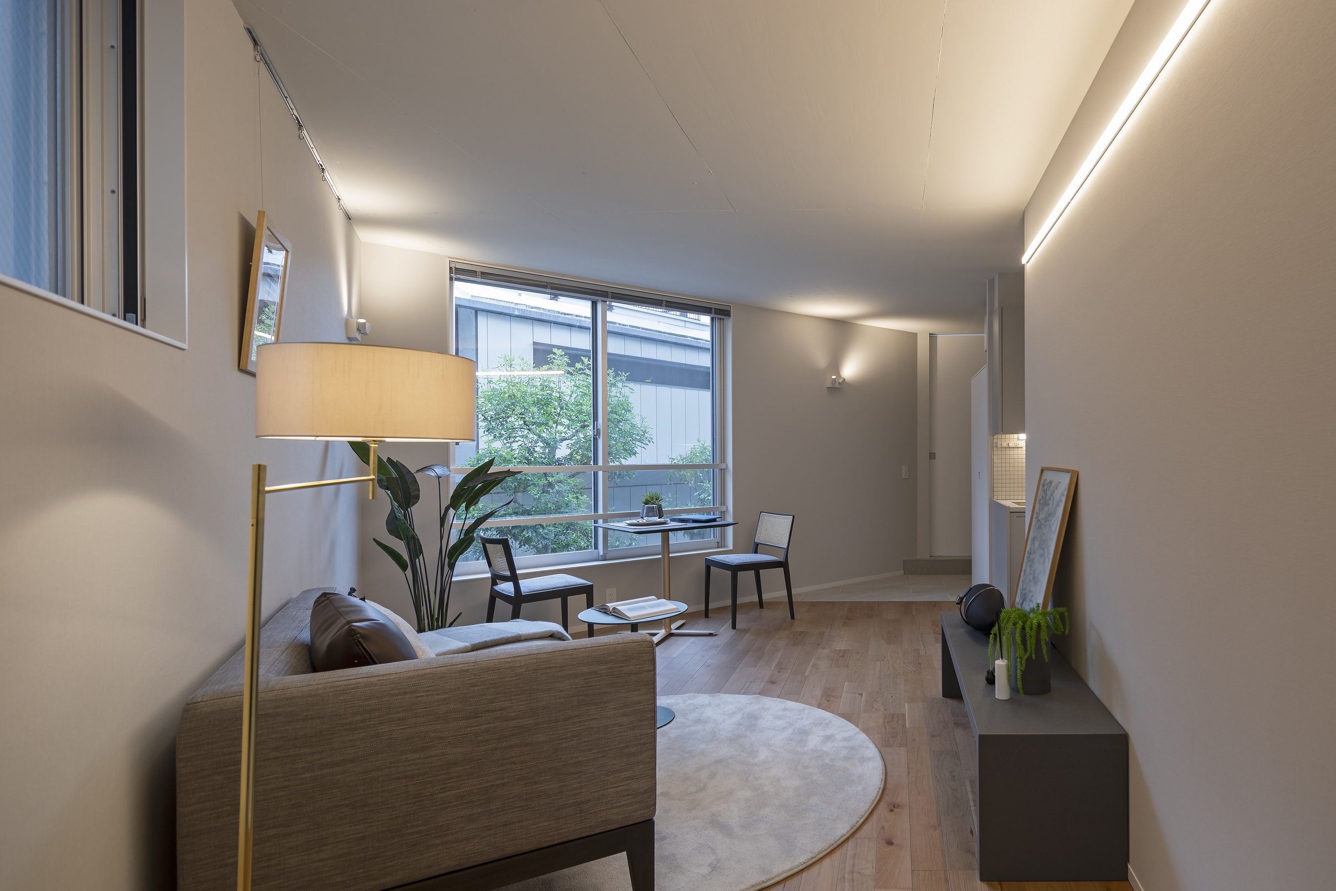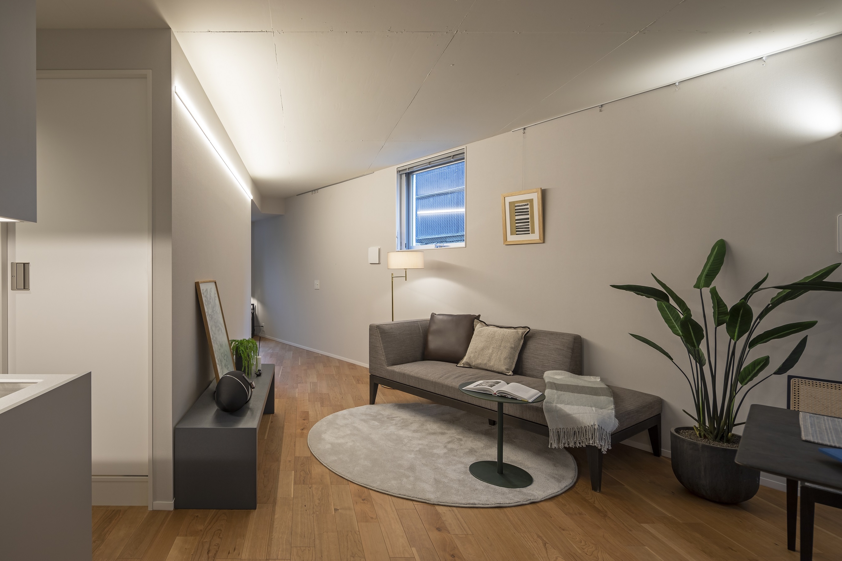 三角形の形状により生まれる奥行が、実際の床面積以上の広がりを感じさせます。緩やかに空間を区切るプランニングのため、ワンルームと言っても1LDKに等しい住み心地と言えます。無駄な要素をそぎ落としたシンプルさの中にも、建築家の細やかな気遣いが感じられるインテリアは忙しい日々の中で不思議と心に余裕を与えてくれるでしょう。この少し複雑な形状の住まいを自分のものにできるのは、人生においても変化や新しい状況を愉しむことができるエネルギッシュな人達です。そんな人たちに、是非この住まいを体験して欲しいと思います。