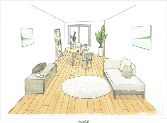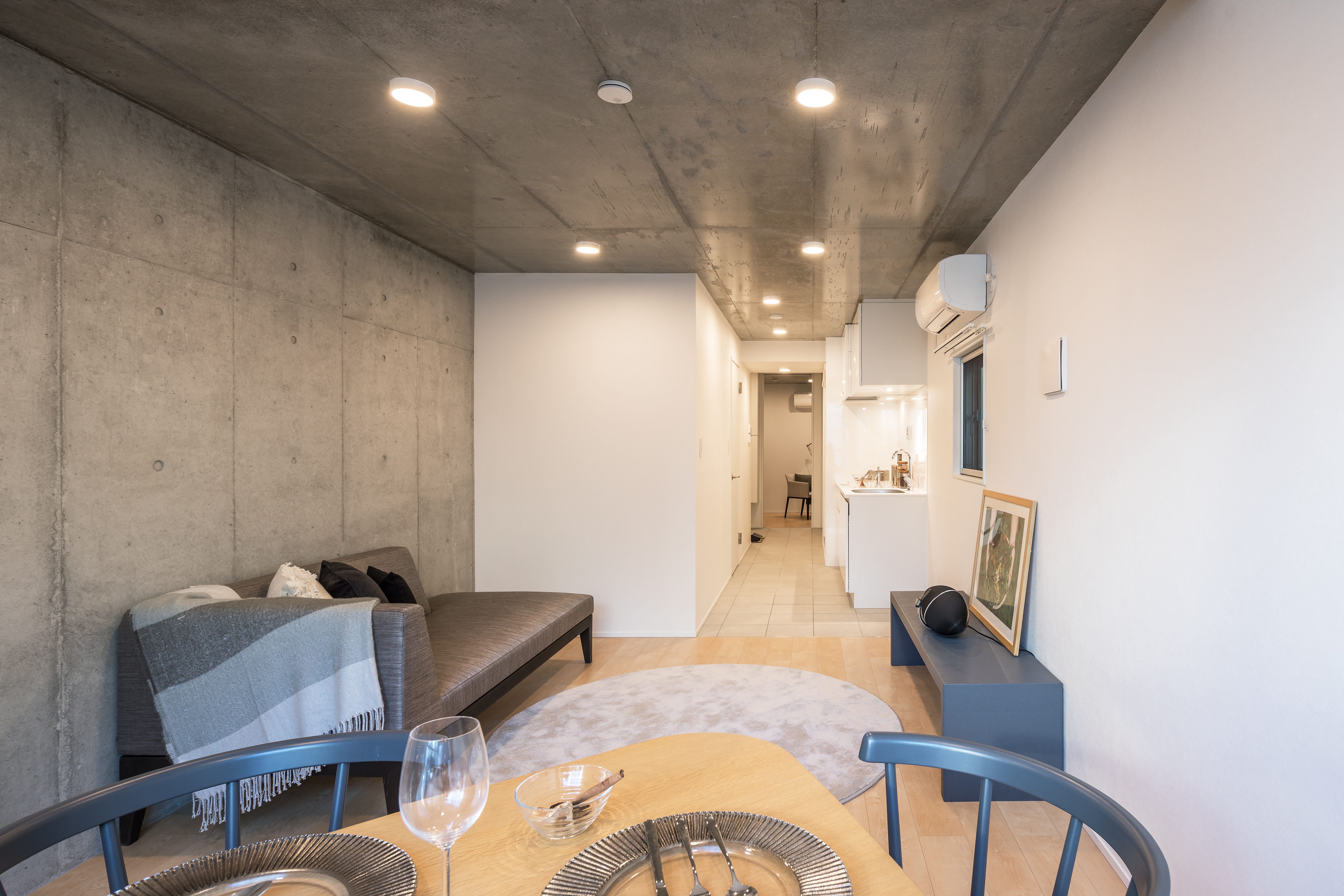 中野再開発エリアに勤める30代独身男性をイメージしました。広いリビングルームには、台形のダイニングテーブルとソファを配置しました。斜め壁が特徴的な部屋の中で、台形のダイニングテーブルは空間にしっかり馴染み広さをより演出します。ソファを中心に置くことで、友人が訪ねてきたときにはソファでくつろぎながらダイニングも一体の空間で使用したりと、フレキシブルに部屋を使うことができます。ベッドルームには在宅の仕事でも落ち着いて作業できる空間を作りました。落ち着いた黒色の家具に温もりを感じる木材を採用することで、リラックスしながら作業を行うことができます。