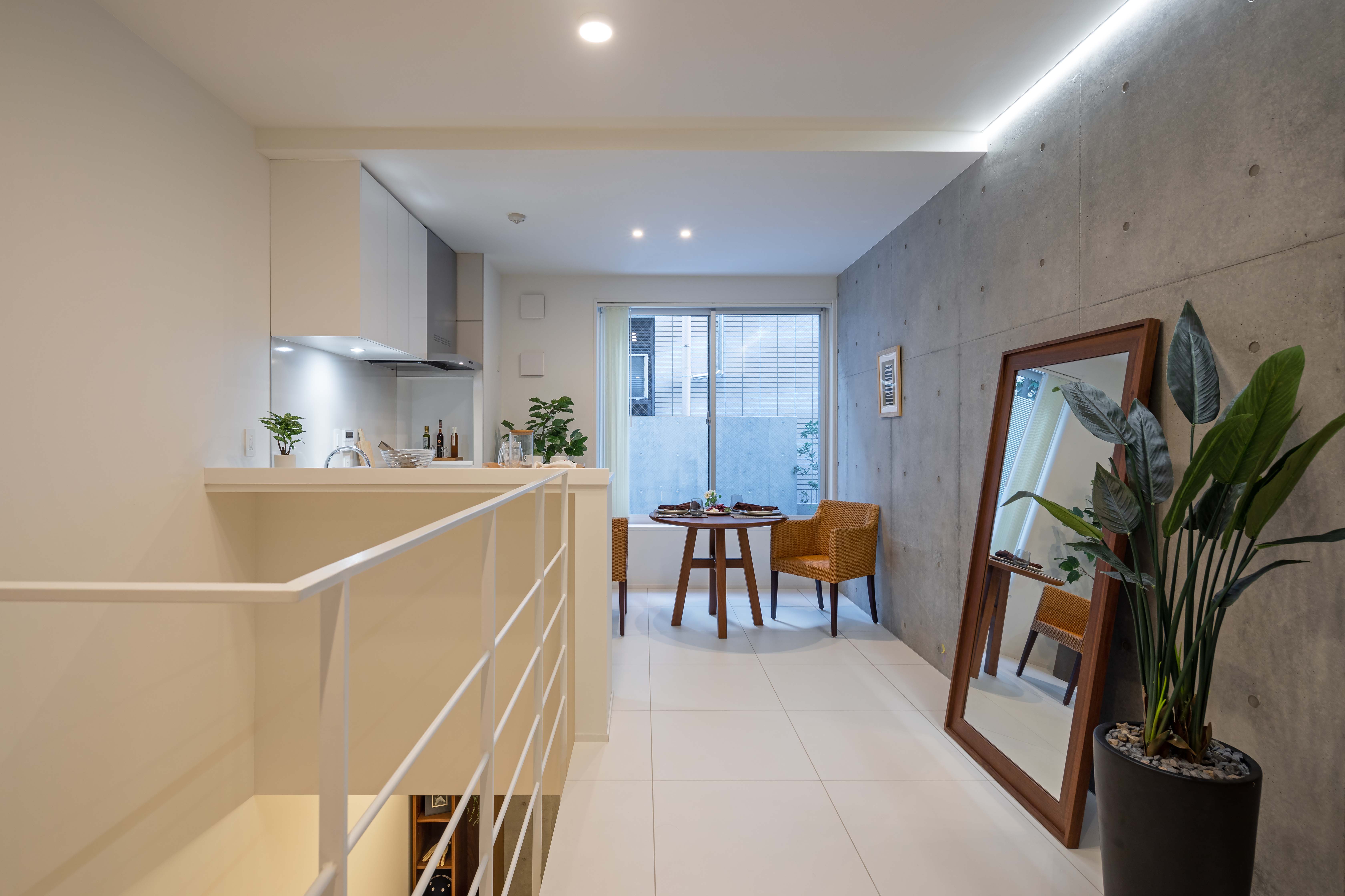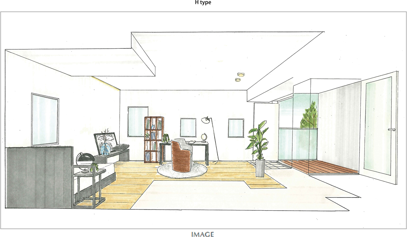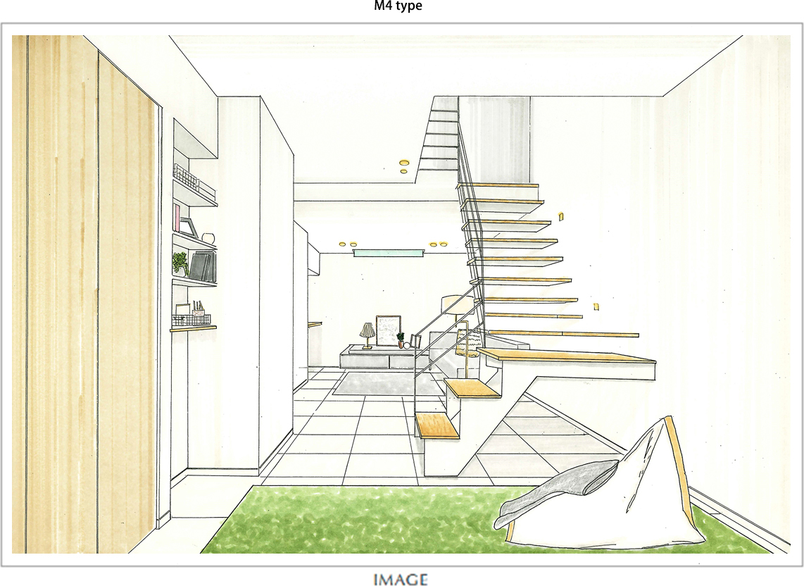 <SINGLE>デザイナー30代前半女性の住居をイメージしました。戸建てのような住み心地、メゾネットタイプの間取りです。1Fはナチュラルな雰囲気のコンサバトリーをイメージ。窓から差し込む太陽の光が、床タイル、ラタン家具や観葉植物などの自然素材に優しく溶け込みます。週末には、友人を招いてアフタヌーンティーを。自然と会話が弾む、明るく心落ち着く空間です。1Fの大きな開口面と、透過性のある階段デザインが地下全体に爽やかな開放感をもたらします。プライバシーが確保された地下では休息や趣味の時間など、心置きなく過ごせます。飾り棚に収納した幼少期から習う乗馬やポロの道具を眺め、読みかけの本を手に取る平日の夜。日々忙しい生活の中の心満ちるひと時に。旅行で訪れたイギリスの美しい生活風景の一部を切り取ったかのようなインテリア。光と風を感じながら気持ち穏やかになれる暮らしのご提案です。
