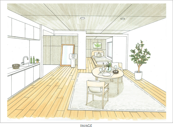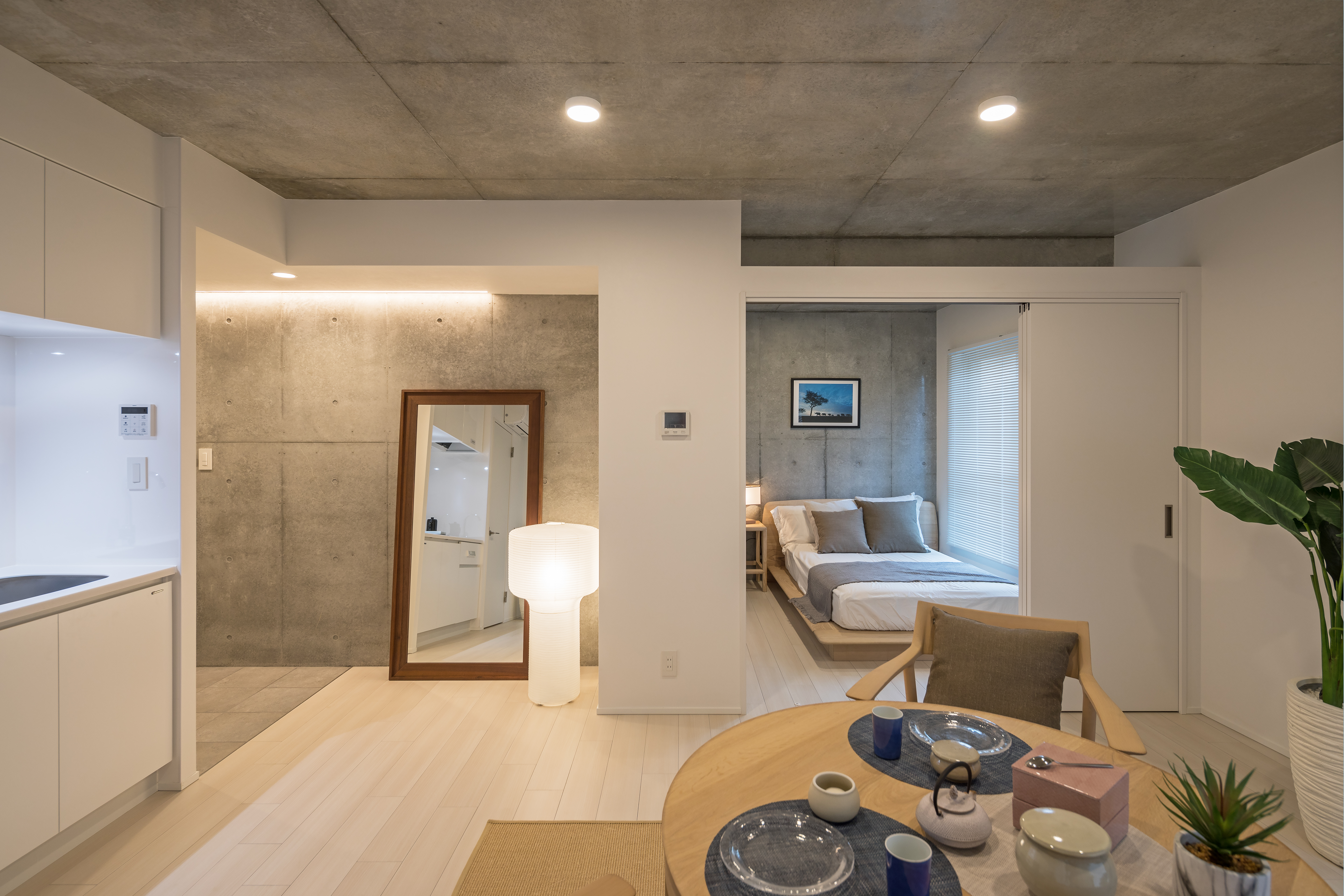 和風家具が好きな30代女性をイメージしました。角地ならではの台形リビングルームに合わせ、円形のダイニングテーブルを配置しました。中心に円形を持ってくることにより、他の家具の配置を制限することがなく緩やかな部屋の形をより引き立てます。ベッドルームには和風の柔らかさを感じる高さが低めのベッドを配置しました。低めのベッドは空間を遮ることが無く部屋を広く感じられることができます。ゆったりとしたエントランスには大きな壁掛け鏡を配置し、和紙を使用した照明で落ち着いた柔らかな雰囲気を作り出しています。