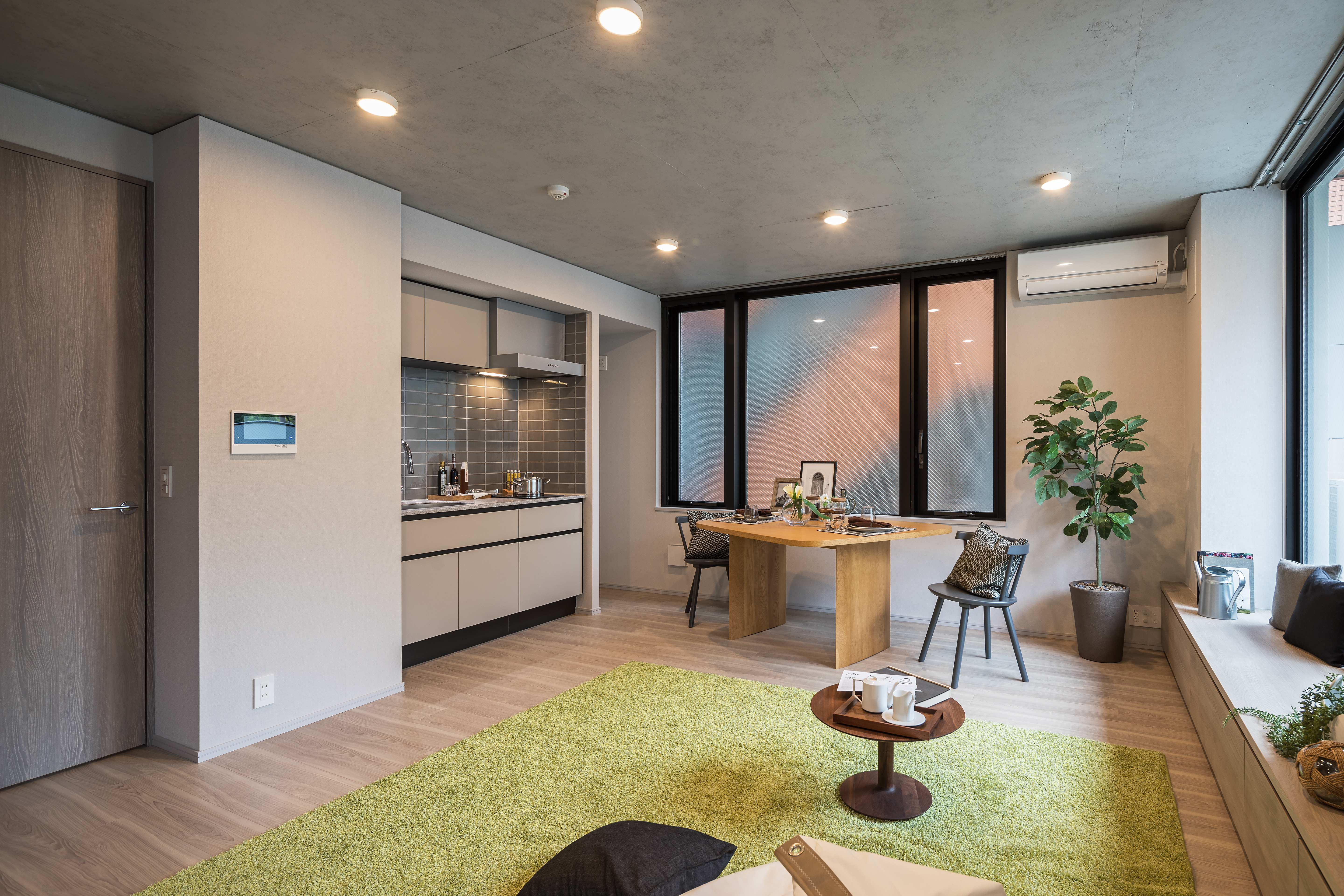 <SINGLE>外資系IT勤務30代後半 女性の住居をイメージしました。仕事柄デジタルデバイスを利用する時間が長いため、自然を連想する素材やアースカラーを中心にまとめた癒しのインテリア。在宅の時間が増えた今、ストレスフリーの生活を支えるのは明るく風通しの良いLDK空間。LDKとベッドルームの建具を開けると空間の繋がりが生まれ、さらに開放的な印象に。大きめ且つユニークな形のデザインが特徴のダイニングテーブルは食卓としてはもちろん、平日の日中はワークスペースとしても機能。窓際のベンチに腰を掛けて風にあたり、コーヒーを一杯。在宅勤務の合間の心休まるひと時に。ビーズクッションに横になりテレビや映画を楽しむ日もあれば、ベッドの上でワインを嗜みながら、ナイトテーブルの代わりにもなるベンチ収納の上に置かれたお気に入りの本を手に取る週末の夜。オンオフの切り替えを楽しみながら充実した日々を過ごすのに最適な新しい住まいのご提案です。