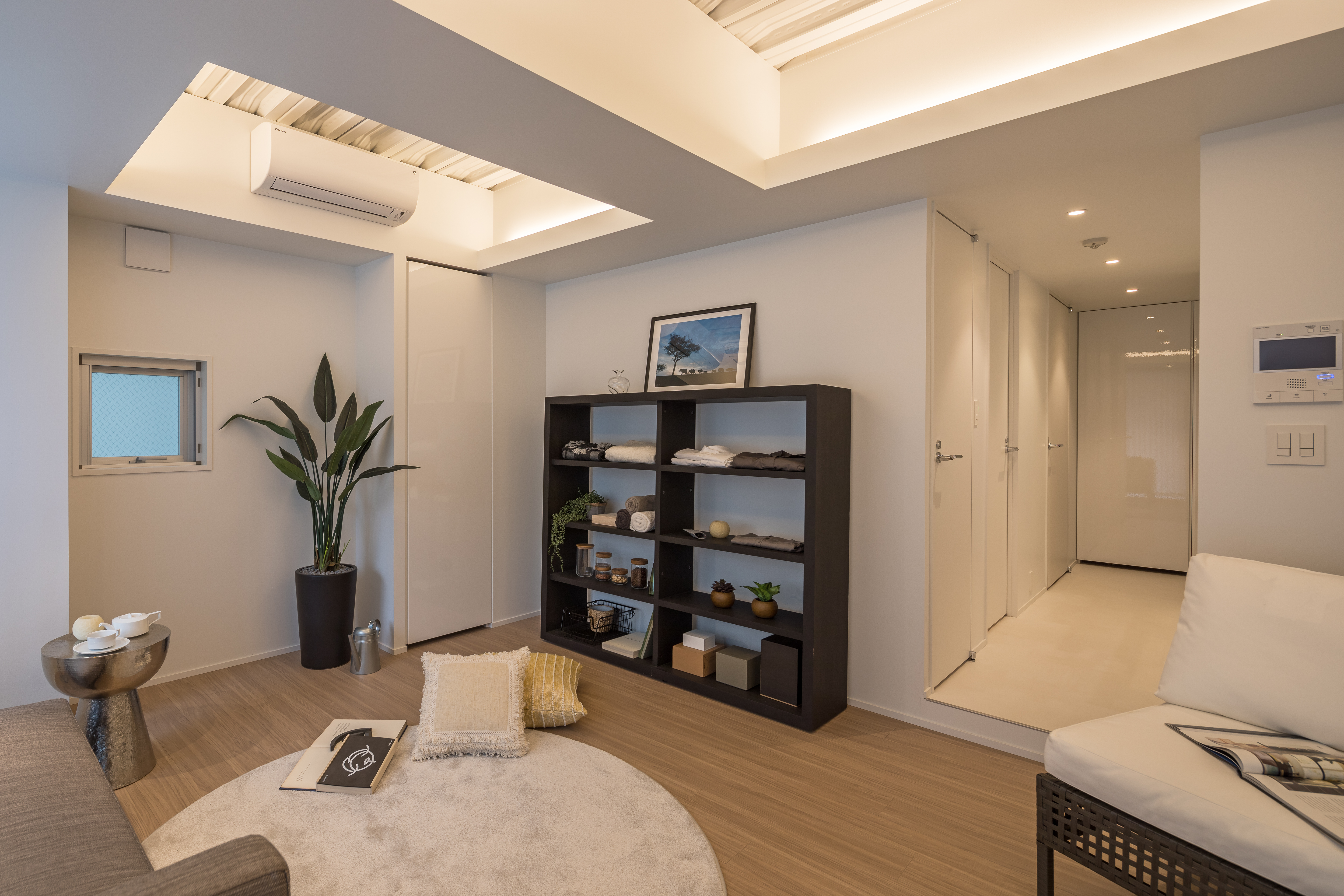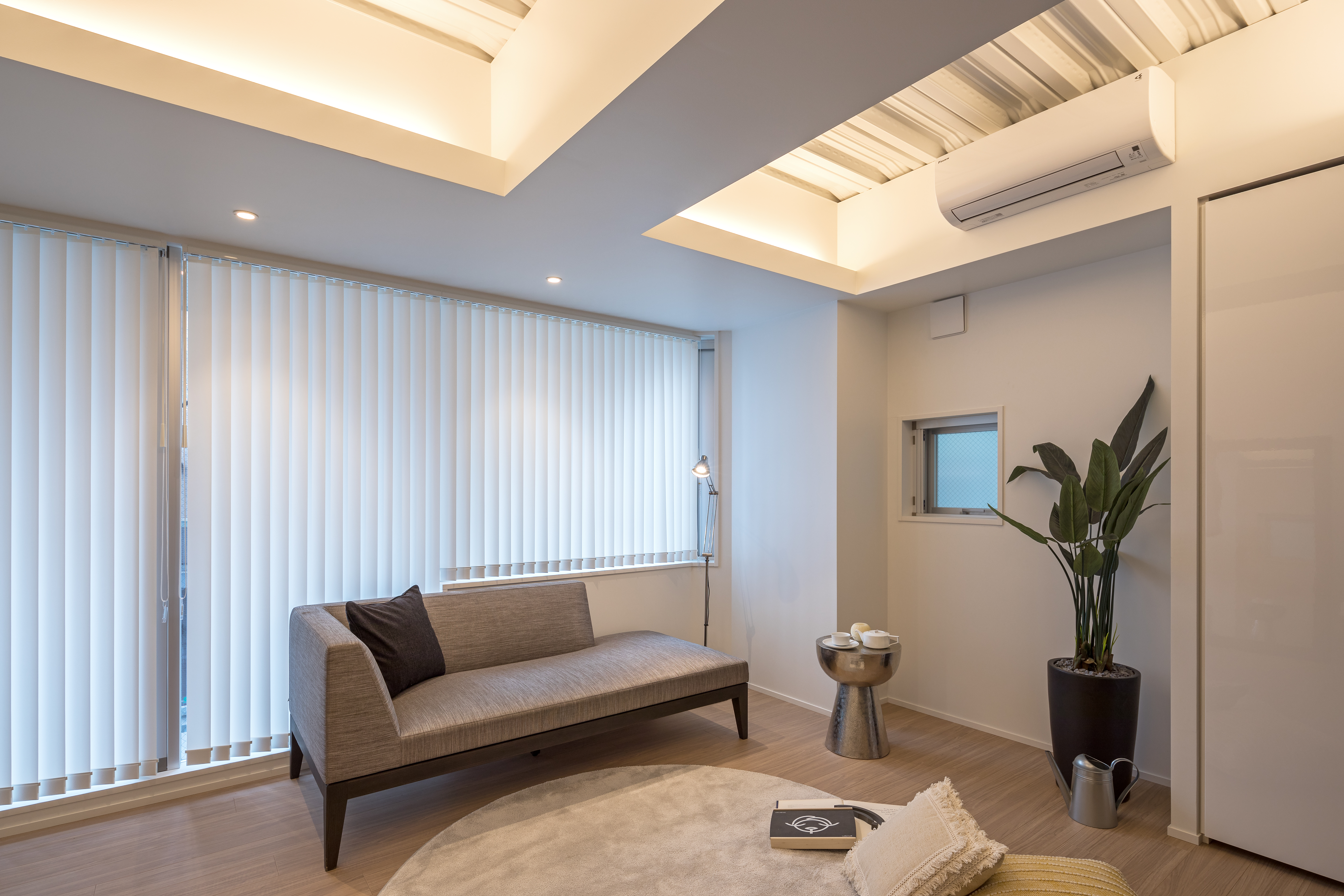 30代ファッションデザイナー女性のSOHOをイメージしました。 リビングには来客用のソファとオープンタイプの飾り棚を配置しました。落ち着いたトーンで、どんな色味の商品でも邪魔することなく、お気に入りのアイテムの良さをより引き立てます。 ソファサイドには大きな額縁の鏡とパーソナルチェアを置き、来客時に実際商品を合わせたり、モノトーンの壁を背景にちょっとした撮影にも使うことができます。 寝室にはダークトーンのデスクとチェアを配置しました。間接照明だけの落ち着いた空間で、時間を気にすることなく1人で作業に集中することができます。