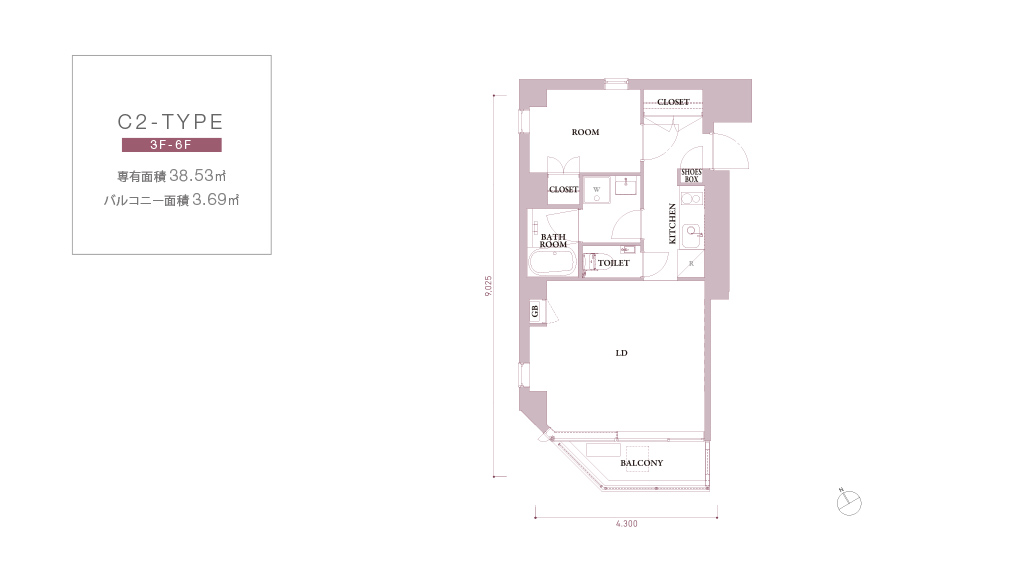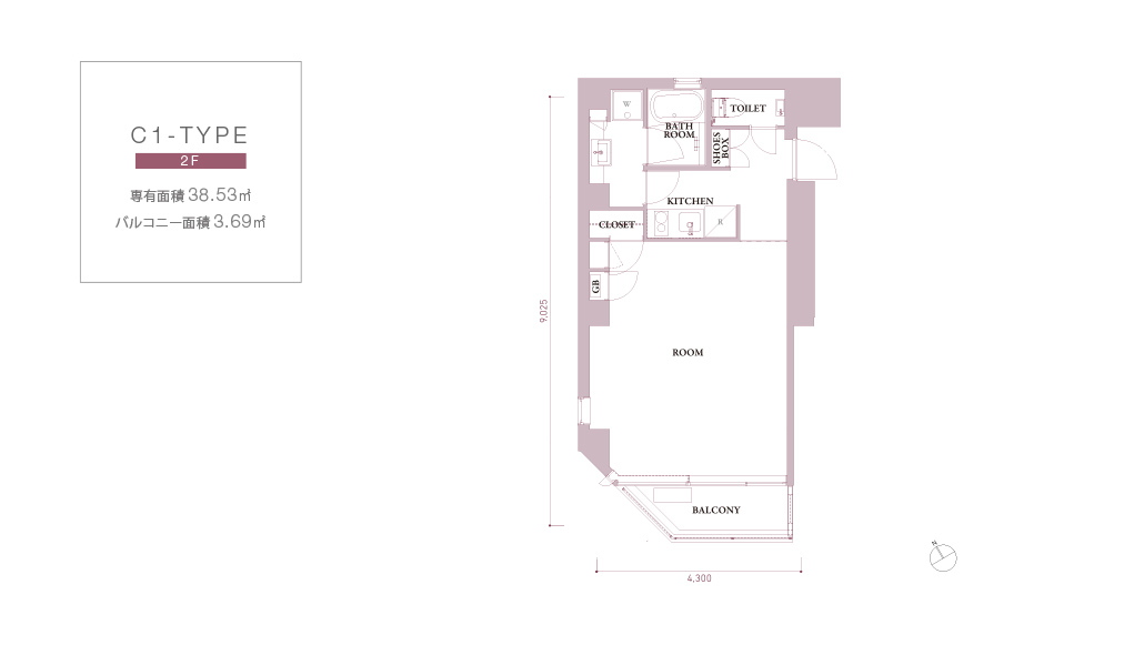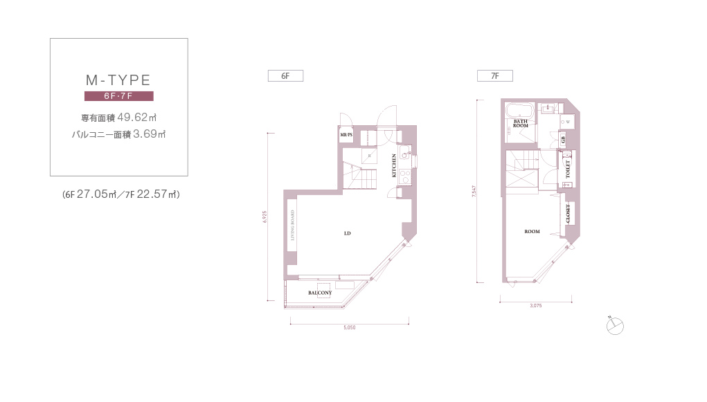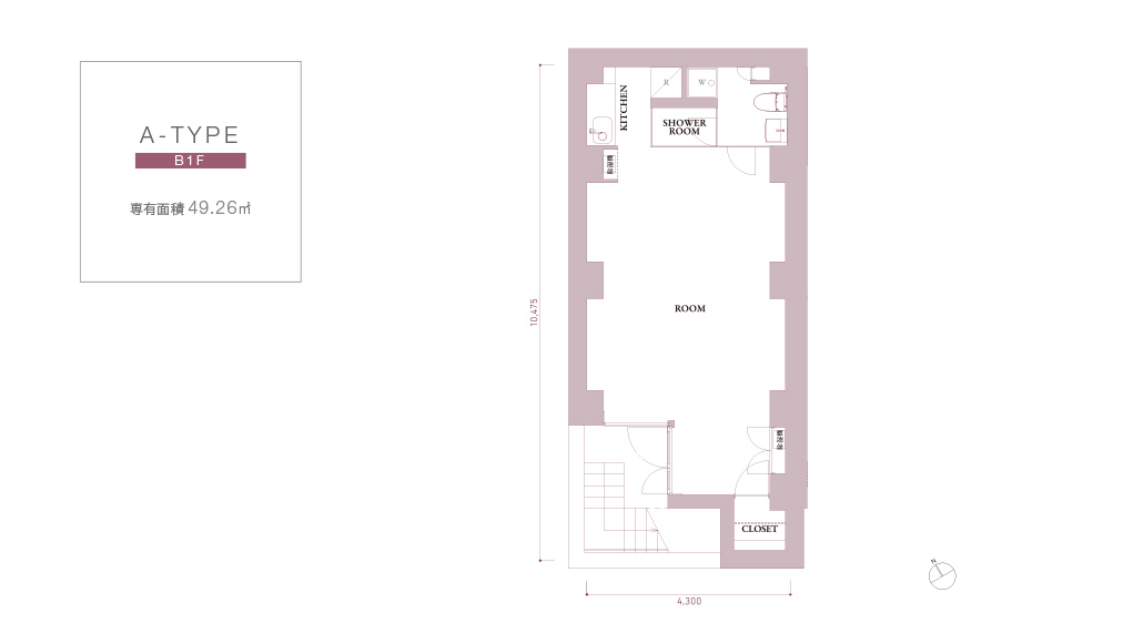 Plan STUDIO / 1LDK ELEVATION DESIGN 南側立面図 東側立面図 北側立面図 西側立面図 ※図面と現況が異なる場合は、現況を優先させていただきます。 PLAN / B1F-6F A-TYPE B1F 専有面積 49.26 ㎡ B-TYPE B1F 専有面積 49.36 ㎡ C1-TYPE 2F 専有面積 38.53 ㎡ バルコニー面積 3.69 ㎡ C2-TYPE 3F-6F 専有面積 38.53 ㎡ バルコニー面積 3.69 ㎡ D-TYPE 2F-5F 専有面積 27.05 ㎡ バルコニー面積 3.69 ㎡ PLAN / MAISONETTE & PENTHOUSE M-TYPE 3F-PH・RF 専有面積 49.62 ㎡ バルコニー面積 3.69 ㎡ P-TYPE 7F 専有面積 47.24 ㎡ バルコニー面積 5.67 ㎡ FIRST BASEMENT / SHOP / 1F 専有面積 69.62㎡