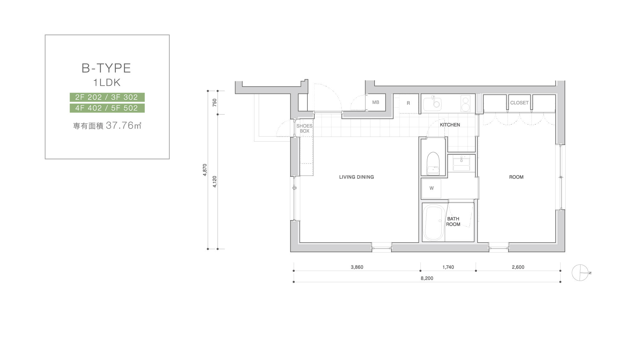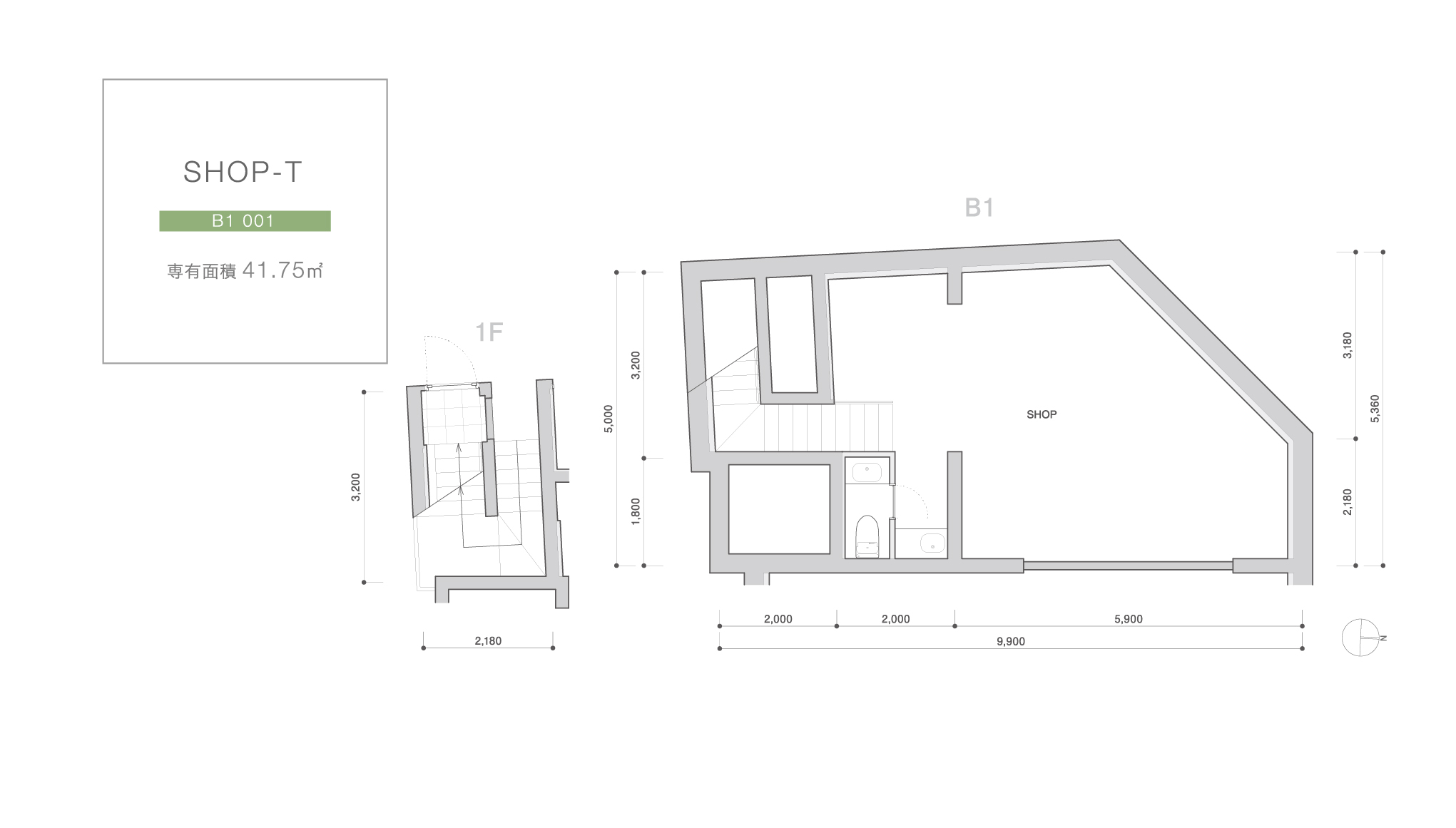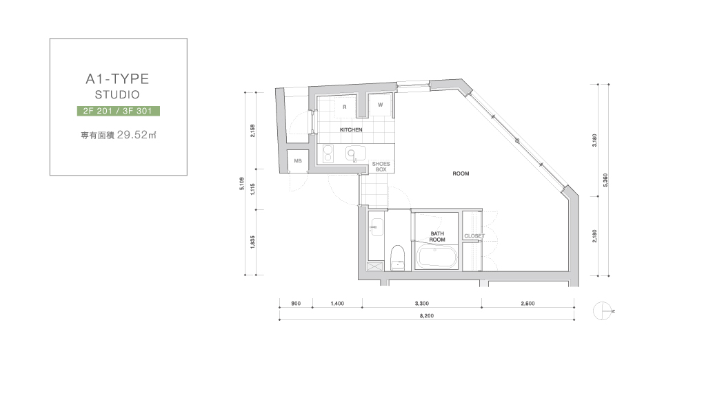 Plan STUDIO・1LDK ELEVATION DESIGN 東側立面図 北側立面図 西側立面図 南側立面図 ※図面と現況が異なる場合は、現況を優先させていただきます。 PLAN 2F-5F A1-Type STUDIO 2F 201 / 3F 301 専有面積 29.52 ㎡ A2-TYPE STUDIO 4F 401 / 5F 501 専有面積 30.84 ㎡ B-TYPE 1LDK 2F 202 / 3F 302 4F 402 / 5F 502 専有面積 37.76 ㎡ SHOP B1-1F SHOP-S 1F 101 専有面積 60.07 ㎡ SHOP-T B1 001 専有面積 41.75 ㎡ SHOP-U B1 002 専有面積 46.58 ㎡ GROUND FLOOR ※図面と現況が異なる場合は、現況を優先させていただきます。