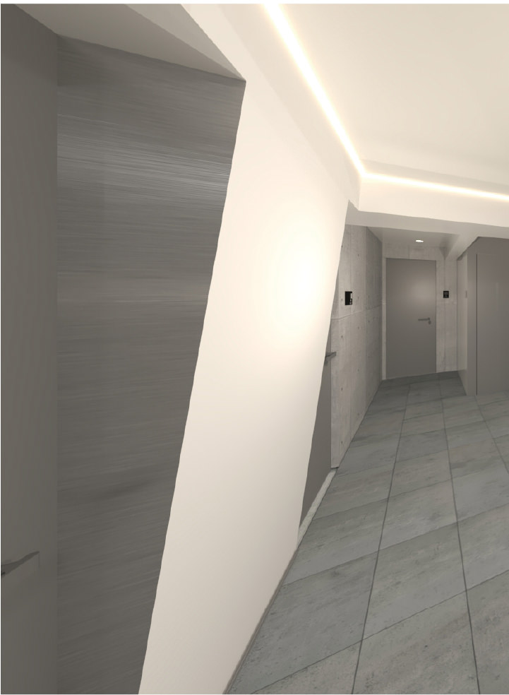 周囲の穏やかな陽光を採り入れたエントランスホール。外観の意匠を受け継ぐように、シフトする壁と金属パネルのエッジが存在感を示します。ライン状の間接照明や床に敷かれた天然石など、モダンな中にも格式高さが漂う迎賓の場です。